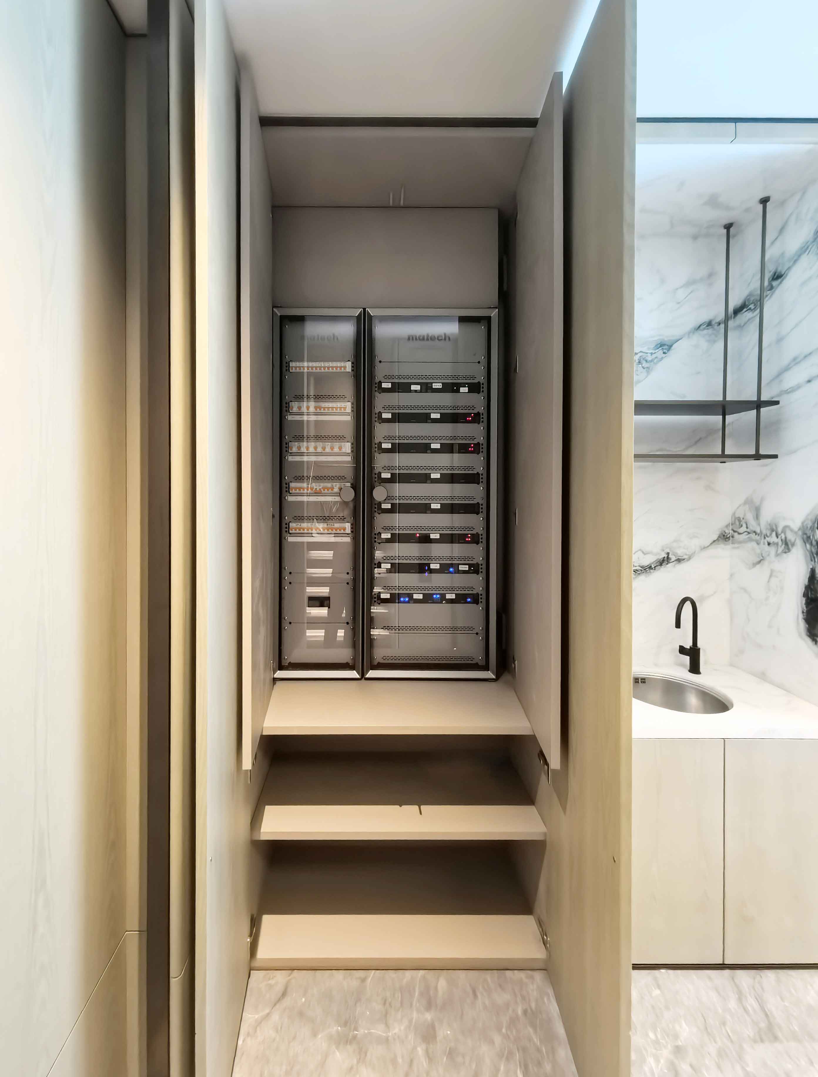 針對(duì)別墅對(duì)品質(zhì)感的高要求,我們?cè)谙潴w外觀上同樣精益求精。每一層的控制箱,我們均選用高品質(zhì)的鉑睿設(shè)備中心系列箱體,將2只箱子無縫組合,形成一個(gè)完整、協(xié)調(diào)、大氣的整體單元。